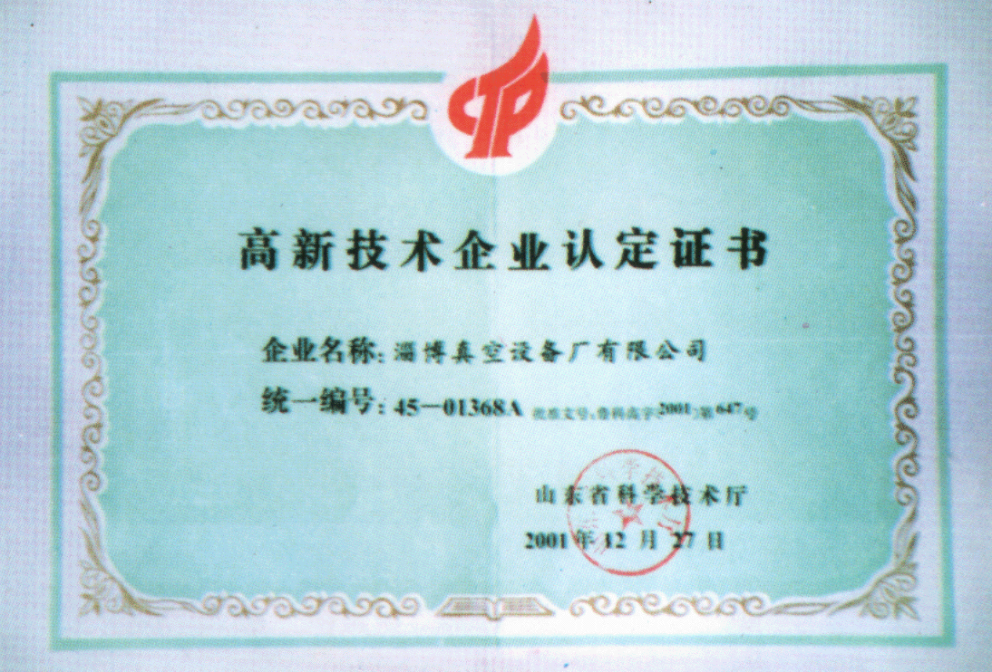 2001年山東省科學(xué)技術(shù)廳授予公司高新技術(shù)企業(yè)認(rèn)定證書