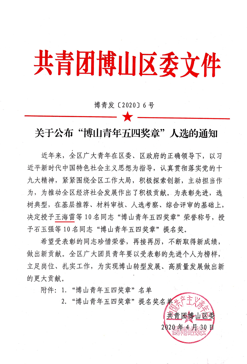 2020年4月30日,共青團(tuán)淄博市博山區(qū)委員會組織召開了“綻放戰(zhàn)役青春  堅(jiān)定制度自信”主題宣講暨優(yōu)秀青年事跡分享會。區(qū)委常委、組織部部長楊發(fā)磊,副區(qū)長李林出席會議。會上授予我公司員工王海雷等10名同志“博山區(qū)青年五四獎?wù)隆睒s譽(yù)稱號。