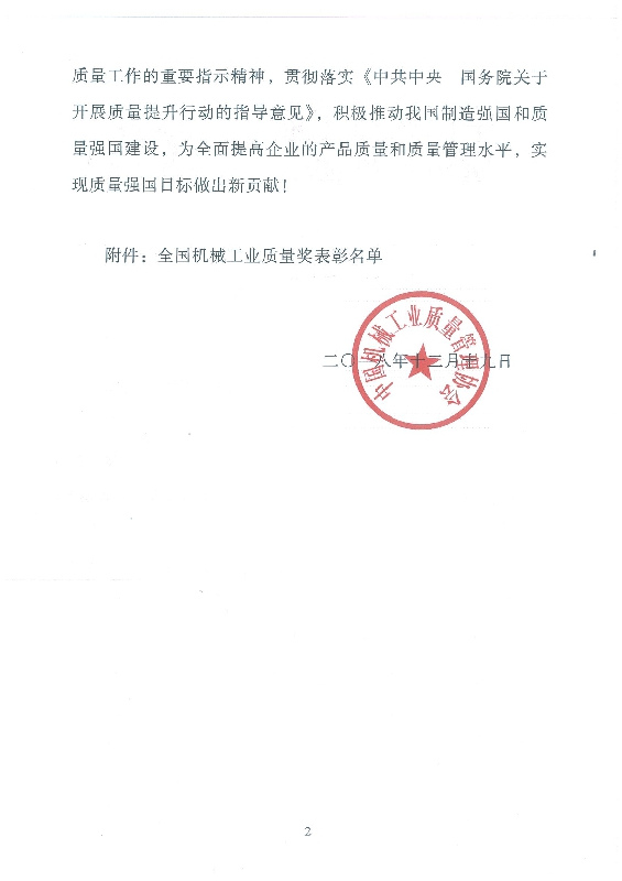 2018年12月19日至20日,中國機械工業(yè)質(zhì)量管理協(xié)會七屆五次理事擴大會議在徐州舉行。會議對在機械工業(yè)質(zhì)量管理中作出優(yōu)異成績的先進企業(yè)和優(yōu)秀個人進行了表彰,公司董事長黃毅同志被授予“全國機械工業(yè)質(zhì)量獎杰出質(zhì)量人”榮譽稱號。
